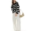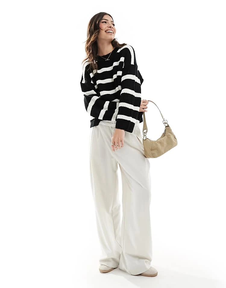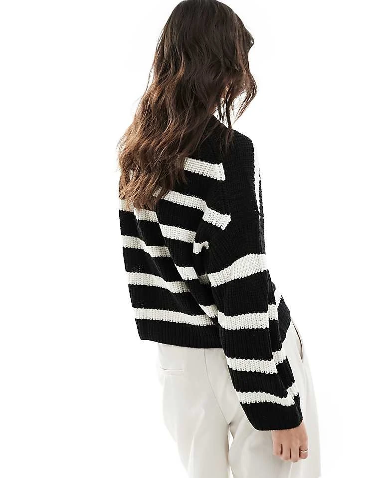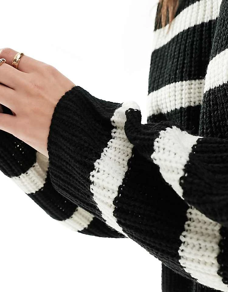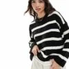 JDY Knitted Crew Neck Jumper In Beige & Black Stripe For Women