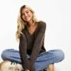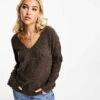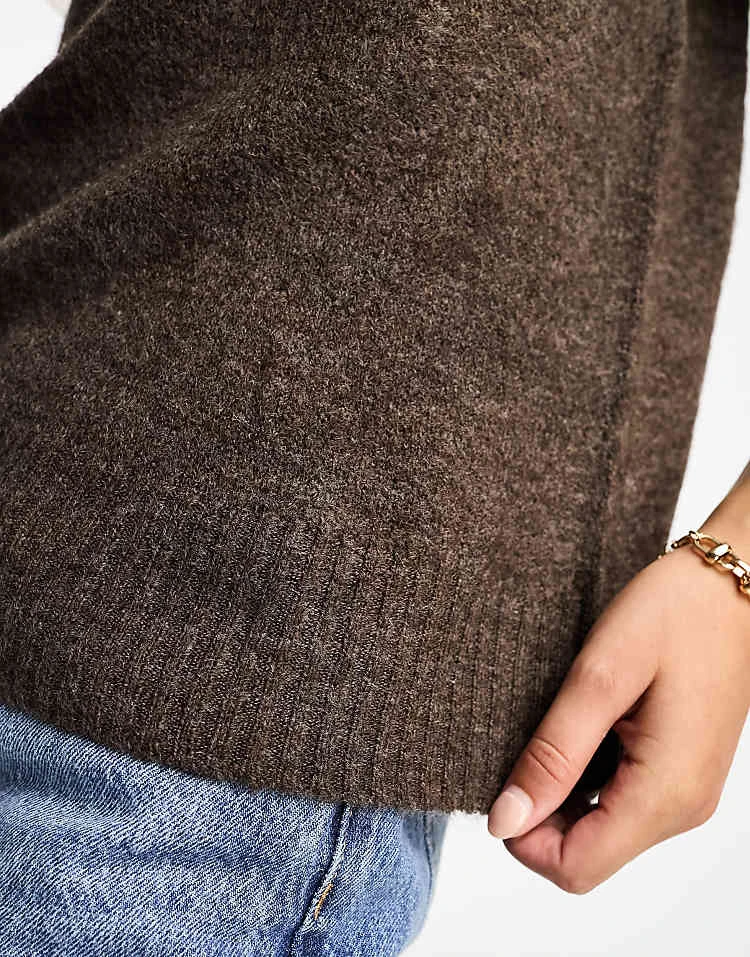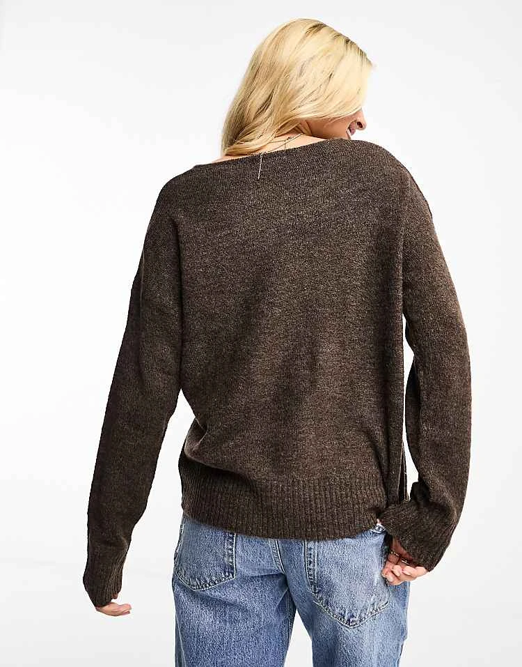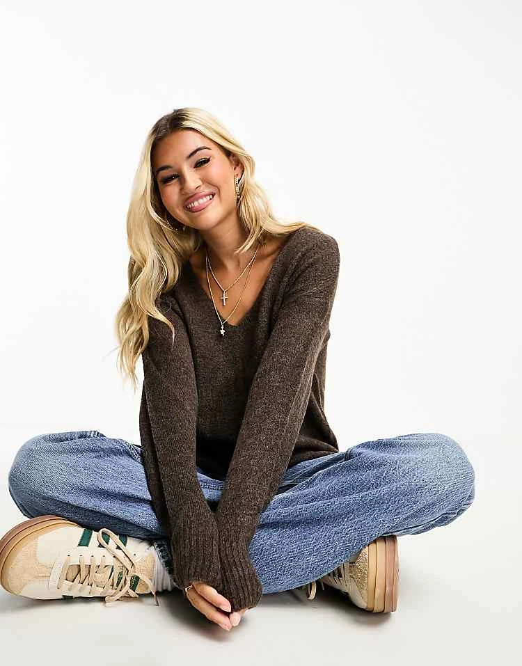 JDY Knitted V Neck Jumper In Brown Melange For Women