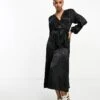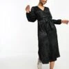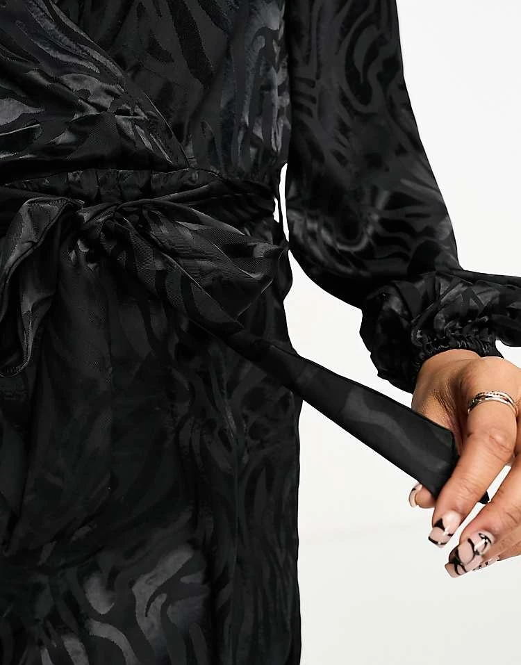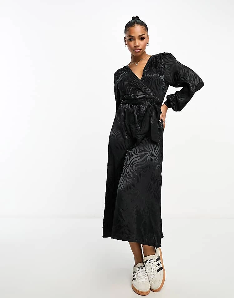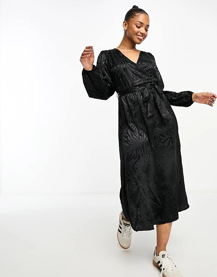 JDY Puff Sleeve Wrap Jacquard Midi Dress In Black Zebra For Women