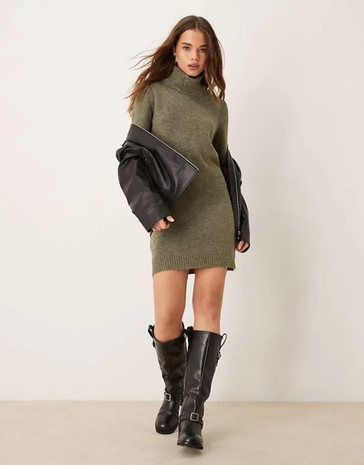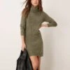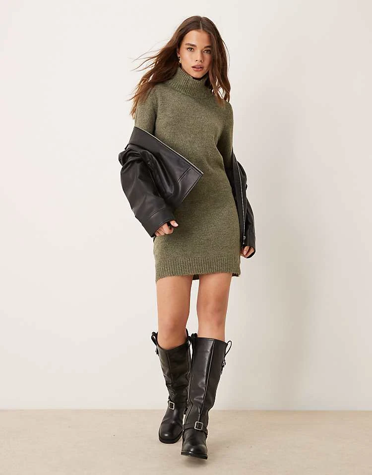 JDY Roll Neck Knitted Dress In Khaki Melange For Women