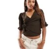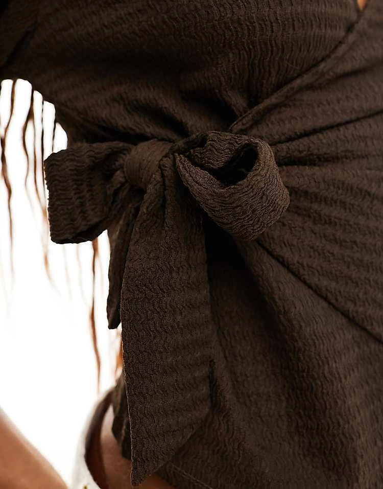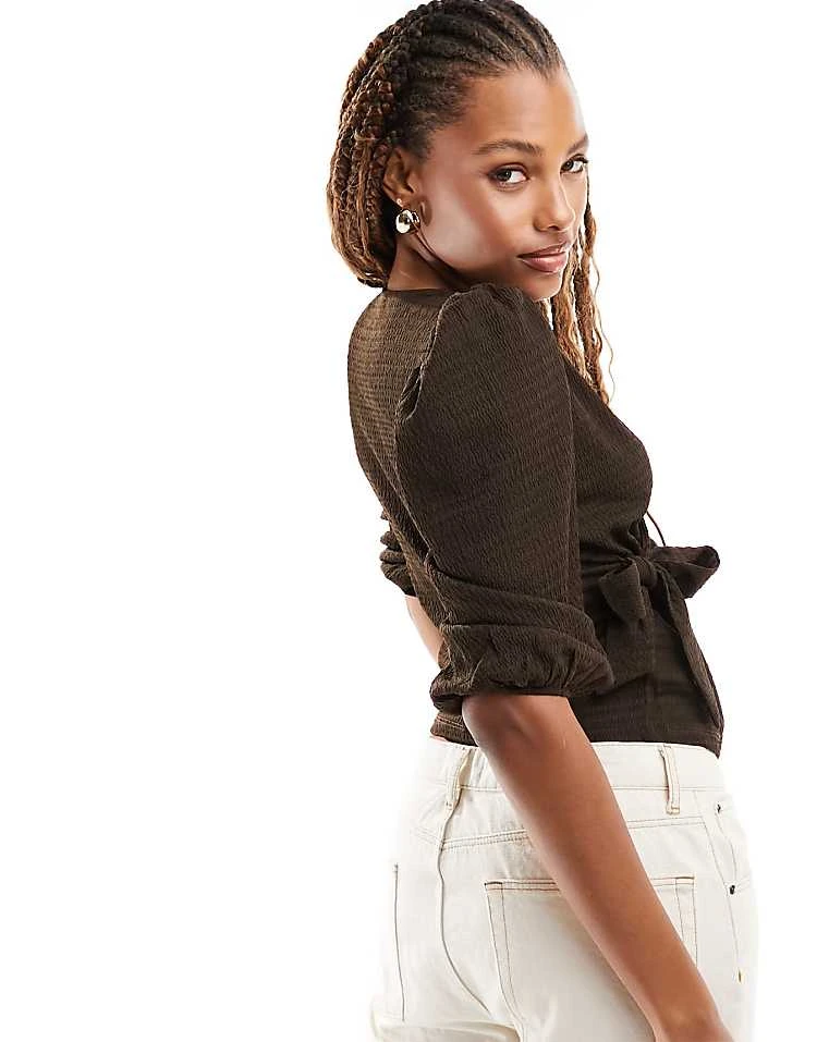 JDY Textured Wrap Crop Top With Tie Front Detail In Brown For Women